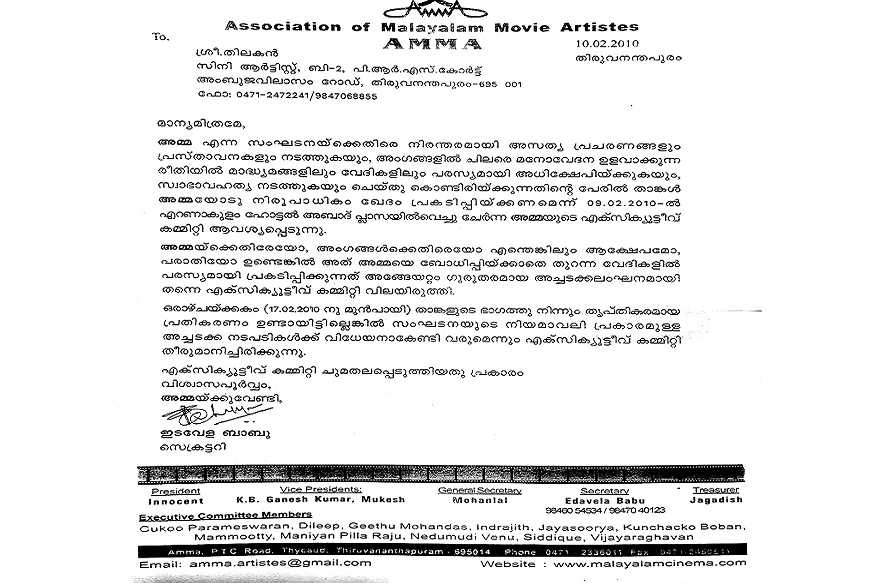 നടൻ നുണ പ്രചാരണം നടത്തുകയും, അമ്മയെ അപകീർത്തിപ്പെടുത്തുന്നുവെന്നും ആയിരുന്നു അമ്മയുടെ ആരോപണം. ഏഴു ദിവസത്തിനുള്ളിൽ തിലകനോട് മറുപടി ആവശ്യപ്പെട്ടിട്ടുമുണ്ടായിരുന്നു. എവിടെ എപ്പോൾ എങ്ങനെ അപകീർത്തിപ്പെടുത്തിയെന്നതിൽ വ്യക്തതയില്ല എന്നായിരുന്നു തിലകന്റെ മറുപടി. ഇതേ തുടർന്ന് അച്ചടക്ക കമ്മിറ്റി മുൻപാകെ ഹാജരാവാൻ തിലകനോട് ആവശ്യപ്പെടുകയായിരുന്നു.എന്നാൽ തിലകൻ ഹാജരായിരുന്നില്ല.