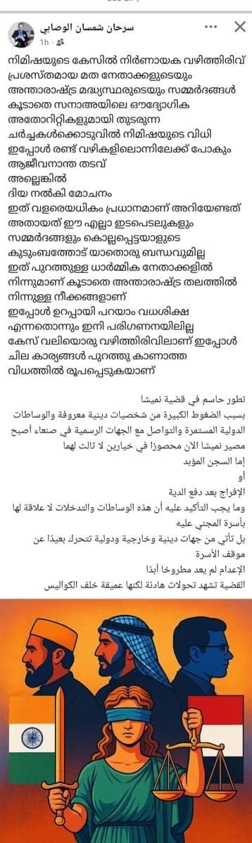ഇതിനിടെ, വധശിക്ഷ സംബന്ധിച്ച വിഷയത്തിൽ അനുകൂല നിലപാടെടുക്കാതെ തലാലിന്റെ സഹോദരനും രംഗത്തുവന്നിട്ടുണ്ട്. നിമിഷ പ്രിയയുടെ വധശിക്ഷ നടപ്പാക്കണമെന്നാവശ്യപ്പെട്ട് യെമനിലെ അറ്റോർണി ജനറലിനയച്ച കത്ത് ഉൾപ്പെടുത്തിയുള്ള പോസ്റ്റാണ് തലാലിന്റെ സഹോദരൻ സമൂഹമാധ്യമത്തിലൂടെ പുറത്തുവിട്ടത്.