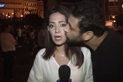 ബെയ്റൂട്ട്: ചാനൽ ലൈവിനിടെ ലെബനീസ് പ്രക്ഷോഭകാരി വനിതാ റിപ്പോർട്ടറെ ചുംബിക്കുന്ന വീഡിയോ സോഷ്യൽമീഡിയയിൽ ചൂടേറിയ ചർച്ചകൾക്ക് വഴിവെച്ചിരിക്കുകയാണ്. യുഎഇ ആസ്ഥാനമായ സ്കൈ ന്യൂസ് അറേബ്യയുടെ പ്രമുഖ റിപ്പോർട്ടറായ ഡാറിൻ എൽ ഹെൽവെ റിയാദിലെ സോലോഹ് ചത്വരത്തിൽ ലൈവായി പരിപാടി അവതരിപ്പിക്കുന്നതിനിടെയാണ് ലെബനീസ് പ്രക്ഷോഭകാരി കവിളിൽ ചുംബനം നൽകിയത്.
