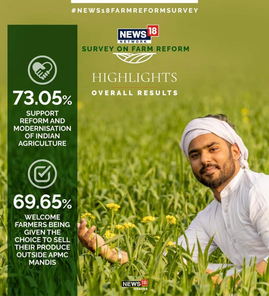72% പേർ ഇന്ത്യൻ കാർഷിക പരിഷ്കരണത്തെയും നവീകരണത്തെയും പിന്തുണയ്ക്കുന്നുവെന്ന് അഭിപ്രായപ്പെട്ടു.കർഷകർക്ക് അവരുടെ ഉൽപ്പന്നങ്ങൾ കൂടുതൽ വിലയ്ക്ക് പുറത്ത് വിൽക്കാൻ അവസരം ലഭിക്കുന്ന സാഹചര്യത്തെ 75 ശതമാനം പേർ സ്വാഗതം ചെയ്യുന്നു. കുറഞ്ഞ താങ്ങുവില തുടരുമെന്ന രേഖാമൂലമുള്ള ഉറപ്പ് സർക്കാർ വാഗ്ദാനം ചെയ്യുന്നതിനെ 59% പേർ പിന്തുണയ്ക്കുന്നു.