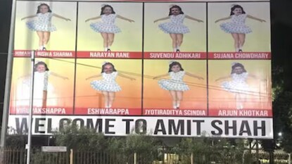 അമിത് ഷായെ പരിഹസിക്കാൻ വാഷിങ് പൗഡർ പരസ്യത്തിലെ പെൺകുട്ടിയെ മോർഫ് ചെയ്ത കൂറ്റൻ ബോർഡ്