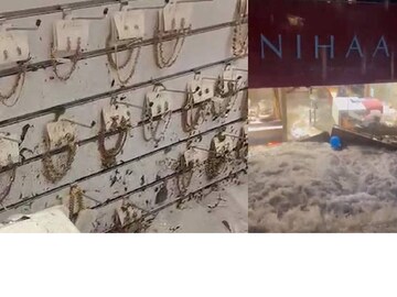 പെട്ടെന്നുണ്ടായ മഴയിൽ വേഗത്തിൽ കടയിൽ വെള്ളവും മാലിന്യവും നിറഞ്ഞതോടെ ഉടമയും ജോലിക്കാരും ജീവനും കൊണ്ടോടി. കുത്തിയൊലിച്ചെത്തിയ വെള്ളം ഷോക്കേസുകളിൽ നിരത്തിവച്ചിരുന്ന ആഭരണങ്ങളടക്കം കവർന്നു. വെള്ളത്തിന്റെ ശക്തിയിൽ ഷോറൂമിന്റെ പിറകുവശത്തെ വാതിൽ തുറന്നതോടെ മുഴുവൻ ആഭരണങ്ങളും നഷ്ടമാക്കുകയായിരുന്നു.
