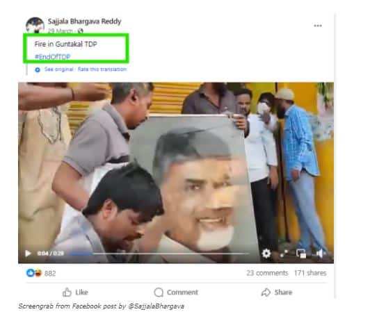 ബിജെപിക്ക് പിന്തുണ പ്രഖ്യാപിച്ചതോടെ പ്രതിഷേധക്കാർ ചന്ദ്രബാബു നായിഡുവിന്റെ ഫോട്ടോ അടിച്ചുതകർക്കുകയും അതിന് തീയിടുകയും ചെയ്യുന്ന വീഡിയോ എന്ന പേരിൽ ഒരു പോസ്റ്റ് വാട്ട്സ്ആപ്പിൽ പ്രചരിക്കുന്നുണ്ട്