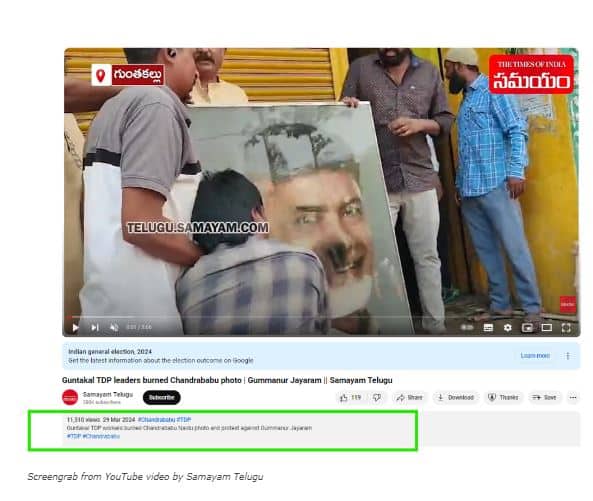 ഇത് ഒരു സൂചന എടുത്ത്, ഞങ്ങൾ ഗൂഗിളിൽ ഇംഗ്ലീഷിൽ, “ഗുണ്ടകൽ,” “ചന്ദ്രബാബു നായിഡു ഫോട്ടോ”, “ഫയർ” എന്നീ കീവേഡുകൾ ഉപയോഗിച്ച് തിരഞ്ഞു. ഇത് 2024 മാർച്ചിൽ സമയം തെലുങ്കിന്റെ ഒരു വീഡിയോ റിപ്പോർട്ടിലേക്ക് നയിച്ചു. അതിൽ വീഡിയോയുടെ ഒരു ചെറിയ പതിപ്പ് കൊടുത്തിട്ടുണ്ട്. “ഗുണ്ടകലിൽ ടിഡിപി പ്രവർത്തകർ ചന്ദ്രബാബു നായിഡുവിന്റെ ചിത്രം കത്തിക്കുകയും ഗുമ്മനൂർ ജയറാമിനെതിരെ പ്രതിഷേധിക്കുകയും ചെയ്തു,” എന്നാണ് വീഡിയോയിലെ വിവരണം.