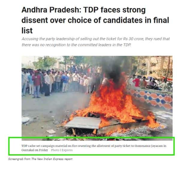 2024 മാർച്ച് 30ലെ ലെ ന്യൂ ഇന്ത്യൻ എക്സ്പ്രസ് റിപ്പോർട്ടിൽ വൈറലായ വീഡിയോയുടെ സ്ക്രീൻഗ്രാബ് കൊടുത്തിട്ടുണ്ട്. “വെള്ളിയാഴ്ച ഗുണ്ടക്കലിൽ ഗുമ്മനൂർ ജയറാമിന് പാർട്ടി ടിക്കറ്റ് അനുവദിച്ചതിൽ പ്രതിഷേധിച്ച് ടിഡിപി കേഡർ പ്രചാരണ സാമഗ്രികൾ കത്തിച്ചു,” എന്ന വിവരണത്തോടൊപ്പമാണ് റിപ്പോർട്ട്.