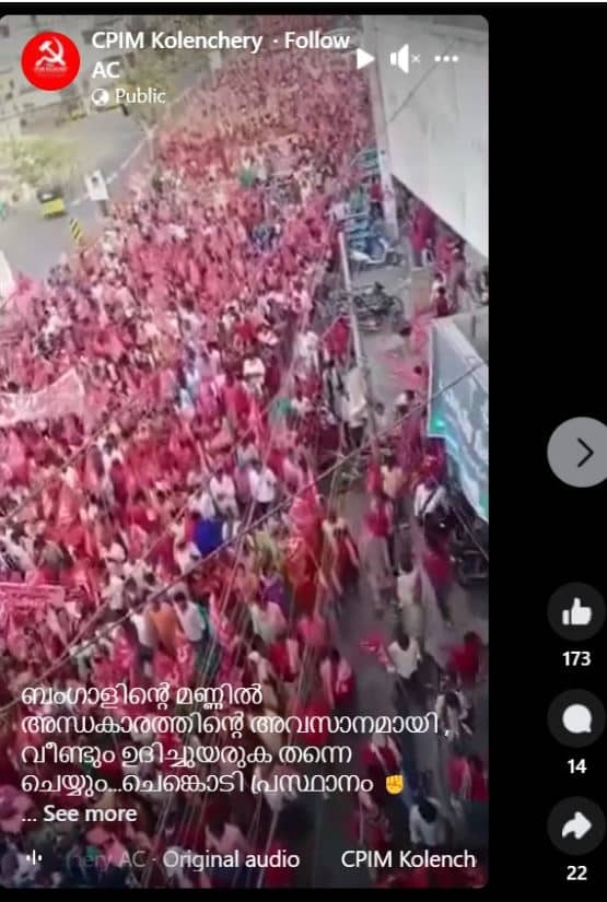ബംഗാളിൽ ഇടതുപക്ഷം നടത്തിയ റാലി എന്ന പേരിൽ ഒരു പോസ്റ്റ് ഫേസ്ബുക്കിൽ വൈറലാവുന്നുണ്ട്. “ബംഗാളിന്റെ മണ്ണിൽ അന്ധകാരത്തിന്റെ അവസാനമായി,വീണ്ടും ഉദിച്ചുയരുക തന്നെ ചെയ്യും. ചെങ്കൊടി പ്രസ്ഥാനം. കരുത്തോടെ കൂടുതൽ കരുത്തോടെ ഒരു യുവത ബംഗാളിൽ പോരാട്ടത്തിന്റെ പുത്തൻ അധ്യായങ്ങൾ എഴുതി ചേർക്കുകയാണ്” എന്ന കുറിപ്പോടെയാണ് ചിത്രം പ്രചരിക്കുന്നത്.
