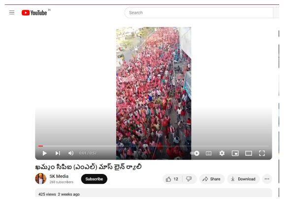 വൈറൽ വീഡിയോ, ഇൻവിഡ് ടൂളിന്റെ സഹായത്തോടെ കീ ഫ്രേമുകളാക്കി. അതിൽ ഒരു കീ ഫ്രെയിം റിവേഴ്സ് ഇമേജ് സേർച്ച് ചെയ്തു. അപ്പോൾ കൂടുതൽ ക്ലാരിറ്റിയുള്ള സമാനായ ഒരു വീഡിയോ എസ്കെ വീഡിയോ എന്ന യൂട്യൂബ് ചാനലിൽ 2024 മേയ് 12ൽ ഷെയർ ചെയ്തത് കണ്ടെത്തി. “ഖമ്മം സിപിഐ (എംഎൽ) മാസ് ലൈൻ റാലി” എന്ന തെലുങ്കിൽ ഉള്ള തലകെട്ടോടെയാണ് ഈ വീഡിയോ പങ്കിട്ടിരിക്കുന്നത്.