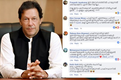 പുൽവാമ ഭീകരാക്രമണത്തിൽ ഇന്ത്യ തിരിച്ചടി നൽകിയതിനു പിന്നാലെ പാകിസ്താൻ പ്രധാനമന്ത്രി ഇമ്രാൻഖാന്റെ പേജിൽ മലയാളികൾ ഉൾപ്പെടെ ഇന്ത്യക്കാരുടെ പൊങ്കാല. അതിർത്തി കടന്നുള്ള ഇന്ത്യൻ ആക്രമണത്തിന് പിന്നാലെ പാക് പ്രധാനമന്ത്രി ഇമ്രാൻ ഖാൻ ദേശീയ സുരക്ഷാ സമിതി യോഗം ചേർന്നുവെന്ന് അറിയിച്ച് ഇട്ട പോസ്റ്റിന് താഴെയാണ് മലയാളികൾ ഉൾപ്പെടെ കമന്റുകളുമായി രംഗത്തെത്തിയിരിക്കുന്നത്.