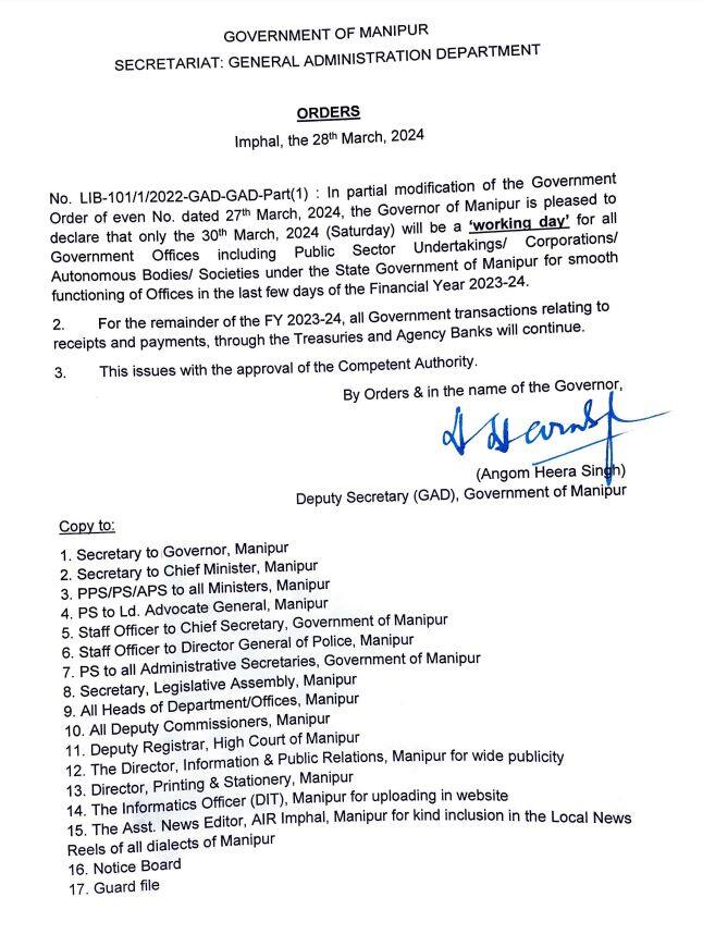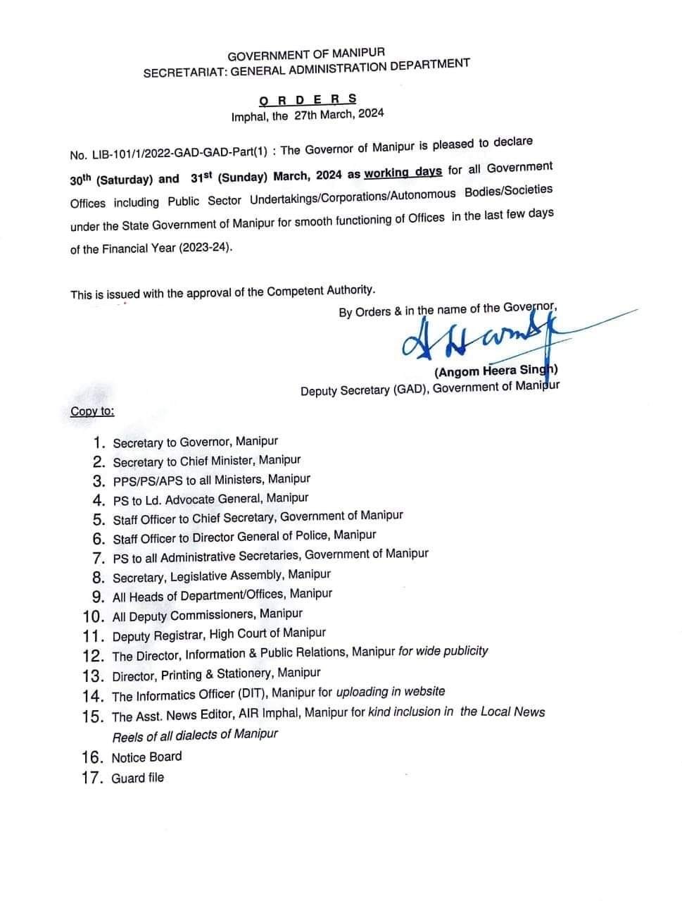 ഈസ്റ്റര് ദിനമായ മാര്ച്ച് 31ന് എല്ലാ സര്ക്കാര് ഓഫീസുകള്ക്കും പ്രവൃത്തിദിനമാക്കിയ ഉത്തരവ് മണിപ്പുര് സര്ക്കാര് പിൻവലിച്ചു. ഈസ്റ്റർ ദിനമായ 31ന് പ്രവൃത്തിദിനമാക്കിയ ഉത്തരവ് പ്രതിഷേധത്തെ തുടര്ന്നാണ് പിൻവലിച്ചത്. ശനിയാഴ്ച (30) മാത്രമായിരിക്കും പ്രവൃത്തിദിനം.