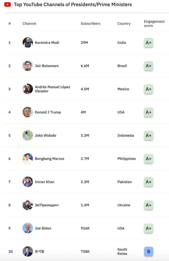 മറ്റു ലോകനേതാക്കളെ അപേക്ഷിച്ച് ബഹുദൂരം മുന്നിലാണ് നരേന്ദ്ര മോദി. പട്ടികയിൽ രണ്ടാമതുള്ള മുൻ ബ്രസീൽ പ്രസിഡന്റ് ജെയർ ബോൾസോനാരോയുടെ സബ്സ്ക്രൈബർമാരുടെ എണ്ണം മോദിയുടെ നാലിലൊന്ന് മാത്രമാണ്. അമേരിക്കൻ പ്രസിഡന്റ് ഡൊണാൾഡ് ട്രംപിനേക്കാൾ ഏഴ് മടങ്ങ് കൂടുതൽ വരിക്കാരാണ് മോദിക്കുള്ളത്. ഇത് അദ്ദേഹത്തിന്റെ ആഗോള ഡിജിറ്റൽ സ്വാധീനത്തെയാണ് അടിവരയിടുന്നത്.
