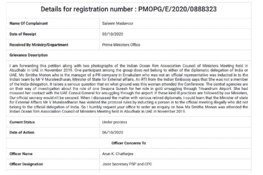 വി. മുരളീധരന് ചട്ടലംഘനം നടത്തിയെന്ന പരാതി: പ്രധാനമന്ത്രിയുടെ ഓഫീസ് റിപ്പോര്ട്ട് തേടി