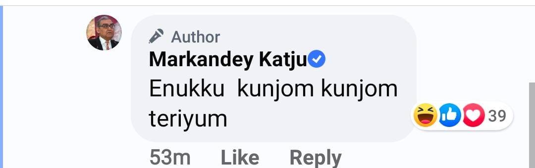 ഇതിനു പിന്നാലെയാണ് തമിഴരോട് ഹിന്ദി പഠിക്കണമെന്ന് നിർദ്ദേശിച്ച് സുപ്രീംകോടതി മുൻ ജഡ്ജി മാർക്കണ്ഡേയ കഠ്ജു രംഗത്തെത്തിയിരിക്കുന്നത്. ഫേസ്ബുക്ക് പോസ്റ്റിലൂടെയാണ് കഠ്ജു ഇക്കാര്യം ആവശ്യപ്പെട്ടിരിക്കുന്നത്. "എന്തുകൊണ്ടാണ് ഈ വിഷയം തമിഴരെ ഇത്രയധികം ബാധിക്കുന്നതെന്ന് എനിക്ക് മനസ്സിലാകുന്നില്ല. ആരും അവരുടെ മേൽ ഹിന്ദി അടിച്ചേൽപ്പിക്കുന്നില്ല. നിങ്ങൾക്ക് ഇത് പഠിക്കണമെങ്കിൽ പഠിക്കുക. നിങ്ങൾക്ക് പഠിക്കാൻ താൽപര്യമില്ലെങ്കിൽ പഠിക്കരുത്. ഇന്ത്യയുടെ ലിങ്ക് ഭാഷയെന്ന നിലയിൽ ഹിന്ദി പഠിക്കാൻ ഞാൻ വ്യക്തിപരമായി തമിഴരോട് നിർദ്ദേശിക്കുന്നു. ഏകദേശം 50% ഇന്ത്യക്കാർ ഹിന്ദി സംസാരിക്കുന്നു (ഒന്നാംഭാഷ അല്ലെങ്കിൽ രണ്ടാം ഭാഷയായി). പക്ഷേ, ഇത് നിങ്ങളുടെ ഇഷ്ടമാണ്, കൂടാതെ ഇത് എന്റ് മാത്രം അഭിപ്രായമാണ്, നിങ്ങൾക്ക് വേണമെങ്കിൽ വിയോജിക്കാം." - കഠ്ജു ഫേസ്ബുക്കിൽ കുറിച്ചു.