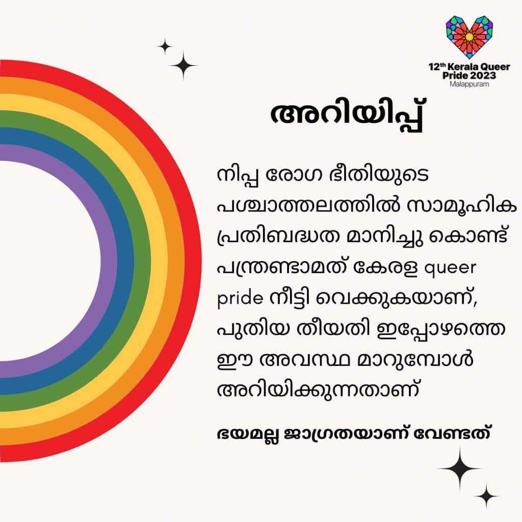 നിപ രോഗബാധയുടെ പശ്ചാത്തലത്തില് സെപ്റ്റംബർ 16,17 തീയതികളില് മലപ്പുറത്ത് നടക്കാനിരുന്ന ; LGBTIQ കൂട്ടായ്മയുടെ കേരള ക്വിയര് പ്രൈഡിന്റെ പന്ത്രണ്ടാം പതിപ്പ് മാറ്റിവെച്ചു. നിലവിലെ സ്ഥിതി മാറിയ ശേഷം പുതുക്കിയ തീയതി അറിയിക്കുമെന്ന് സംഘാടകര് വ്യക്തമാക്കി. കേരളത്തിലെ എല്ജിബിടിഐക്യൂ സമൂഹത്തിന്റെ ഏറ്റവും പ്രധാനപ്പെട്ട കൂട്ടായ്മയാണ് കേരള ക്വിയര് പ്രൈഡ്.