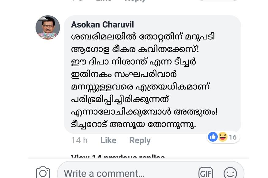 'ശബരിമലയില് തോറ്റതിന് മറുപടി ആഗോള ഭീകര കവിതക്കേസ്! ദീപാ നിശാന്ത് എന്ന ടീച്ചര് ഇതിനകം സംഘരിവാര് മനസ്സുള്ളവരെ എത്രയധികമാണ് പരിഭ്രമിപ്പിച്ചിരിക്കുന്നത് എന്നാലോചിക്കുമ്പോള് അത്ഭുതം! ടീച്ചറോട് അസൂയ തോന്നുന്നു.' അശോകന് ചരുവില് പറയുന്നു.