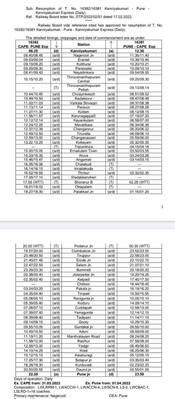 പൂനെയിലേക്കുള്ള ട്രെയിൻ രാവിലെ 10.15ന് തിരുവനന്തപുരത്തും 11.27ന് കൊല്ലത്തും ഉച്ചയ്ക്ക് 1.22ന് കോട്ടയത്തും വൈകിട്ട് മൂന്ന് മണിയോടെ എറണാകുളം നോർത്തിലും എത്തും. തൃശൂരിൽ വൈകിട്ട് 4.52നും പാലക്കാട്ട് 6.27നും ട്രെയിൻ എത്തിച്ചേരും.