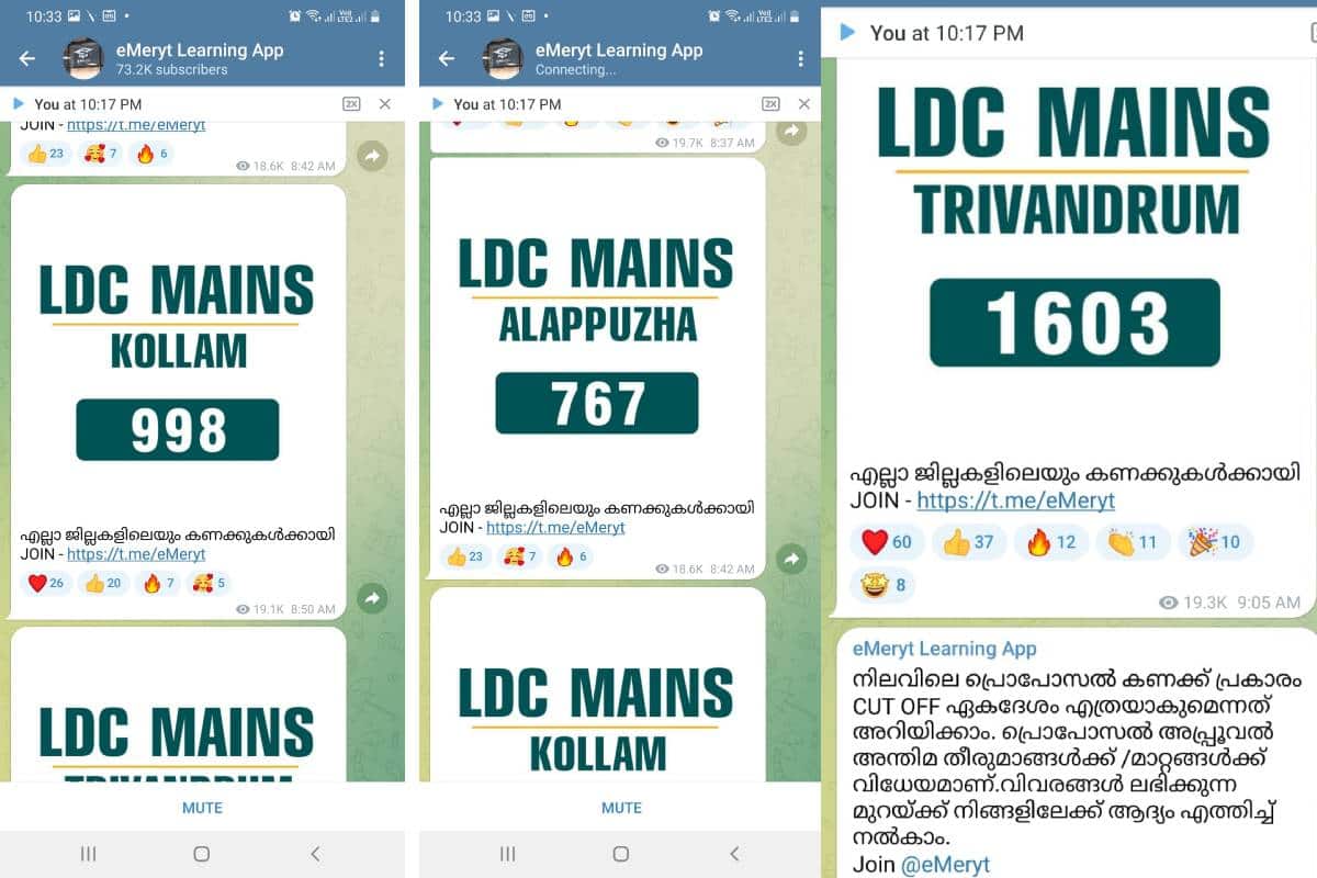 തിരുവനന്തപുരം: പി എസ് സി റാങ്ക് (PSC)പട്ടിക പുറത്തു വരും മുൻപ് നിർണായക വിവരങ്ങൾ പുറത്തുവിട്ട് മത്സരപരീക്ഷാ പരിശീലന കേന്ദ്രങ്ങൾ. ടെലഗ്രാം ചാനലിലൂടേയും മൊബൽ ആപുകളിലൂടേയുമാണ് പട്ടികയുടെ വിശദാംശങ്ങൾ എന്നവകാശപ്പെടുന്ന വിവരങ്ങൾ പുറത്തുവിടുന്നത്. ഇ-മെറിറ്റ് ലേണിംഗ് ആപ് പുറത്തുവിട്ട എൽഡിസി റാങ്ക് പട്ടികയുടെ വിശദാംശങ്ങൾ ന്യൂസ് 18നു ലഭിച്ചു. പരീക്ഷയുടെ കട്ട് ഒഫ് മാർക്ക് എത്രയെന്ന് നേരത്തേ അറിയിക്കാമെന്ന ഉറപ്പ് ടെലഗ്രാം ഗ്രൂപ്പിന്റെ അഡ്മിൻ ഉദ്യോഗാർഥികൾക്കു നൽകുന്നുമുണ്ട്.
