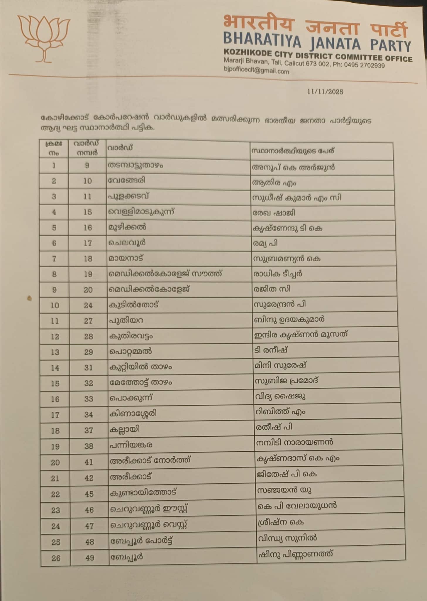 കോഴിക്കോട് കോർപറേഷനില് ബിജെപി ആദ്യഘട്ടത്തിൽ 45 സ്ഥാനാർത്ഥികളെ പ്രഖ്യാപിച്ചു; 28 വനിതകൾ