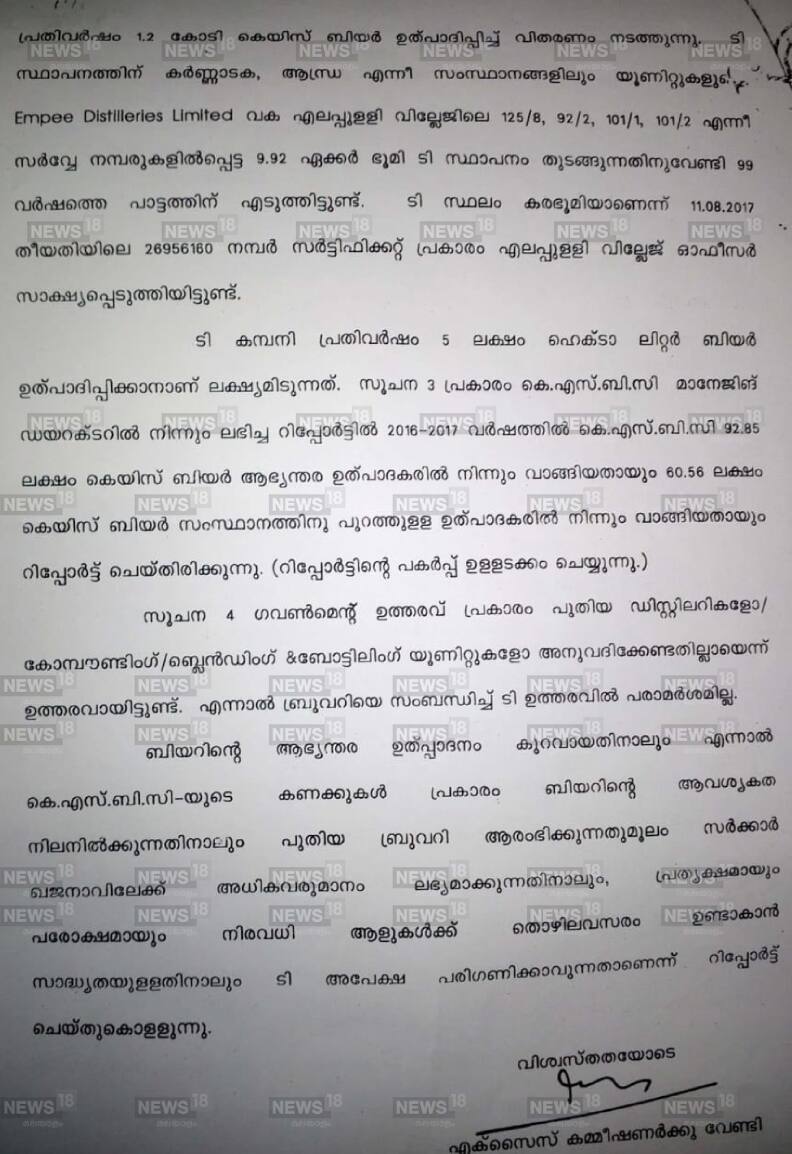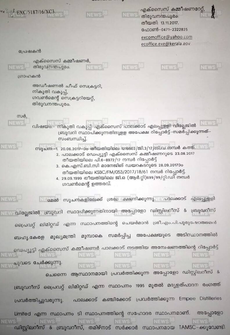 എക്സൈസ് കമ്മിഷണര്ക്കു നല്കേണ്ട അപേക്ഷയാണ് അസാധാരണ നടപടികളിലൂടെ നേരിട്ട് മുഖ്യമന്ത്രിക്കു സമര്പ്പിച്ചത്. പരിസ്ഥിതി ആഘാത പഠനം ഉള്പ്പെടെയുള്ള വിഷയങ്ങള് പരിഗണിക്കാതെ ഈ അപേക്ഷ എക്സൈസ് കമ്മിഷണര് അനുവദിക്കുകയും ചെയ്തു.