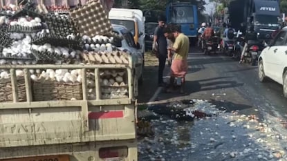 മുട്ടയുമായി വന്ന ലോറിയുടെ പിന്നിൽ ബസിടിച്ച് കാൽ ലക്ഷത്തോളം മുട്ട റോഡിൽ വീണ് പൊട്ടി