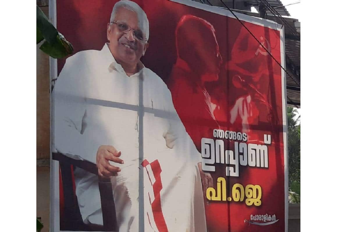'ഞങ്ങടെ ഉറപ്പാണ് പി ജെ'; മുഖ്യമന്ത്രിയുടെ ധർമടത്ത് പി ജയരാജന്റെ ചിത്രം പതിച്ച പ്രചാരണ ബോർഡ്