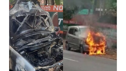 തിരുവനന്തപുരത്ത് ഓടിക്കൊണ്ടിരുന്ന കാറിന് തീപിടിച്ചു; മുൻഭാഗം പൂർണമായും കത്തി നശിച്ചു