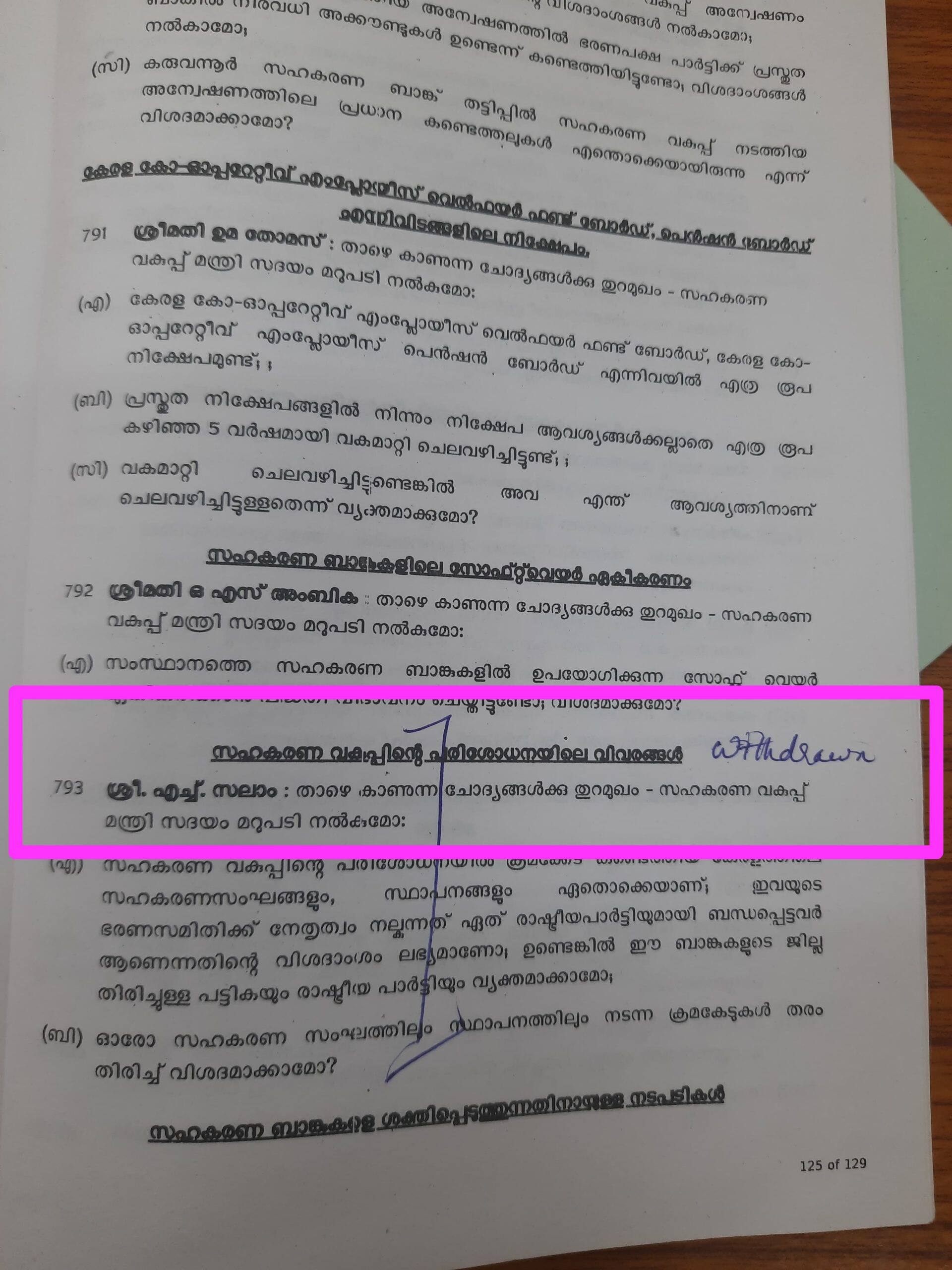 ഓരോ സഹകരണ സംഘത്തിലും നടന്ന ക്രമക്കേടുകൾ തരംതിരിച്ച് വ്യക്തമാക്കുമോ എന്നതായിരുന്നു രണ്ടാമത്തെ ചോദ്യം. പത്ത് ദിവസം മുൻപ് എംഎൽഎ കൊടുത്ത ചോദ്യം നിയമസഭാ വെബ്സൈറ്റിൽ പ്രസിദ്ധീകരിച്ചിരുന്നു. മറുപടി ലഭ്യമാക്കാനായി സഹകരണ വകുപ്പിലെത്തിയപ്പോഴാണ് ചോദ്യത്തിലെ പ്രശ്നം ബന്ധപ്പെട്ടവർക്ക് മനസിലായത്. ഉദ്യോഗസ്ഥർ വിഷയം സഹകരണ മന്ത്രിയുടെ ഓഫീസിന്റെ ശ്രദ്ധയിൽപ്പെടുത്തി. പാർട്ടി ഇടപെട്ടതോടെ സലാം ചോദ്യം പിൻവലിക്കാൻ നിയമസഭാ സെക്രട്ടറിക്ക് അപേക്ഷ നൽകി.
