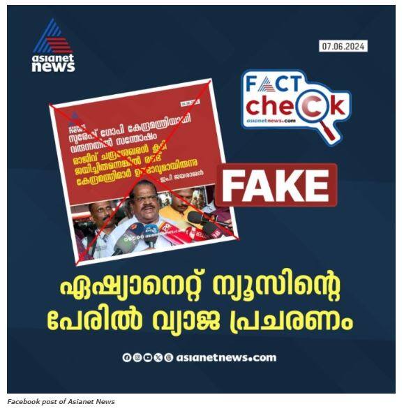 “സുരേഷ് ഗോപി കേന്ദ്രമന്ത്രിയായി വരുന്നതിൽ സന്തോഷം രാജീവ് ചന്ദ്രശേഖരൻ കൂടി ജയിച്ചിരുന്നെങ്കിൽ രണ്ട് കേന്ദ്രമന്ത്രിമാർ ഉണ്ടാവുമായിരുന്നു – ഇപി ജയരാജൻ,” എന്നെഴുതിയ ഏഷ്യാനെറ്റ് ന്യൂസിന്റെ ന്യൂസ്കാർഡ് വ്യാജമാണെന്ന് ഞങ്ങളുടെ അന്വേഷണത്തിൽ ബോധ്യപ്പെട്ടു.