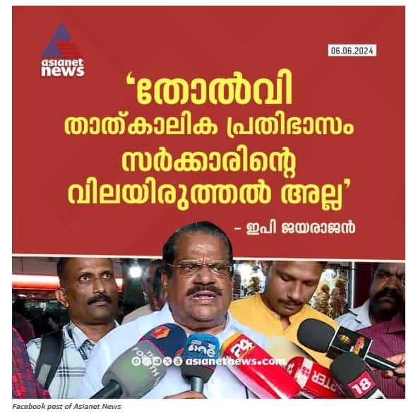 “ലോക്സഭ തിരഞ്ഞെടുപ്പ് തോൽവി താത്കാലിക പ്രതിഭാസം, സർക്കാരിന്റെ വിലയിരുത്തല് അല്ലെന്ന് ഇപി ജയരാജന്,” എന്ന തലക്കെട്ടിലുള്ള ഒരു വാർത്തയും ജൂൺ 6ന് ഏഷ്യാനെറ്റ് ന്യൂസിനെ വെബ്സൈറ്റിൽ നിന്നും കിട്ടി.
