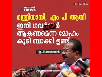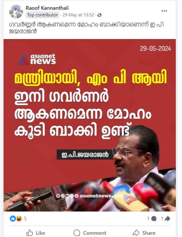 എല്ഡിഎഫ് കണ്വീനര് ഇ പി ജയരാജന്റെ പേരില് ഒരു പ്രസ്താവന ഇപ്പോള് സമൂഹമാധ്യമങ്ങളില് പ്രചരിക്കുകയാണ്. മന്ത്രിയായി എംപിയായി ഇനി ഗവര്ണര് ആകണമെന്ന ആഗ്രഹം ബാക്കിയുണ്ട് എന്ന് ഇ പി ജയരാജന് പറഞ്ഞു എന്നതാണ് പ്രചാരണം. ഏഷ്യാനെറ്റ് ന്യൂസ് നല്കിയ വാര്ത്തയെന്ന പേരിലാണ് പ്രചാരണം. 'എന്റെ കോണ്ഗ്രസ്' എന്ന ഫേസ്ബുക്ക് ഗ്രൂപ്പില് റൗഫ് കണ്ണന്തളി എന്ന വ്യക്തി പങ്കുവെച്ചിരിക്കുന്ന പോസ്റ്റിന് നിരവധി റിയാക്ഷനുകളും ഷെയറുകളും ലഭിച്ചിട്ടുണ്ട്.