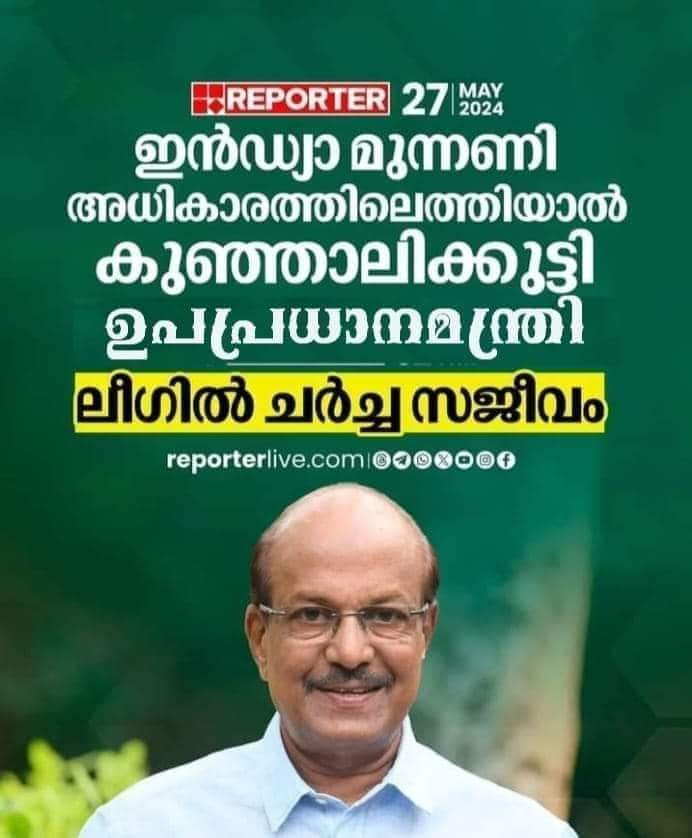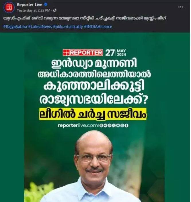 ഇൻഡി മുന്നണി അധികാരത്തിലെത്തിയാല് മുസ്ലിം ലീഗ് ജനറല് സെക്രട്ടറിയും എംഎൽഎയുമായ പി കെ കുഞ്ഞാലിക്കുട്ടിയെ ഉപപ്രധാനമന്ത്രിയാക്കാന് ലീഗില് ചര്ച്ചകള് സജീവമായി നടക്കുന്നുവെന്ന തലക്കെട്ടില് റിപ്പോര്ട്ടര് ചാനലിന്റെ പേരിലുള്ള വാര്ത്താ കാര്ഡാണ് സമൂഹമാധ്യമങ്ങളില് പ്രചരിക്കുന്നത്.