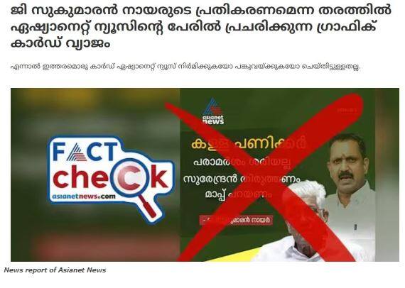 എന്നാൽ കീ വേർസ് സെർച്ചിൽ ഈ വാർത്ത വ്യാജമാണ് എന്ന് വ്യക്തമാക്കുന്ന ജൂൺ 11,2024 ലെ ഒരു വാർത്ത ഏഷ്യാനെറ്റ് ന്യൂസിന്റെ വെബ്സൈറ്റിൽ കണ്ടു. “ഏഷ്യാനെറ്റ് ന്യൂസിന്റെ ഗ്രാഫിക് കാർഡെന്ന പേരിൽ വ്യാജ പ്രചാരണം. ജി സുകുമാരൻ നായരുടെ പ്രതികരണം എന്ന തരത്തിലാണ് പ്രചാരണം നടക്കുന്നത്. പ്രചരിക്കുന്ന ഗ്രാഫിക് കാർഡിൽ ‘കള്ള പണിക്കർ’ എന്ന പരാമർശം തിരുത്തണമെന്ന് ജി സുകുമാരൻ നായർ ആവശ്യപ്പെട്ടു എന്ന തരത്തിലാണ് ചേർത്തിരിക്കുന്നത്. ഇരുവരുടെയും ചിത്രത്തിനൊപ്പം ഏഷ്യാനെറ്റ് ന്യൂസിന്റെ ലോഗോയും ഇന്നത്തെ ഡേറ്റും ചേർത്താണ് പ്രചരിപ്പിക്കുന്ന വ്യാജ കാർഡ് തയ്യാറാക്കിയിരിക്കുന്നത്. എന്നാൽ ഇത്തരമൊരു കാർഡ് ഏഷ്യാനെറ്റ് ന്യൂസ് നിർമിക്കുകയോ പങ്കുവയ്ക്കുകയോ ചെയ്തിട്ടുള്ളതല്ല,” എന്നായിരുന്നു വാർത്ത.