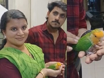 ജിതിന്റെയും നിധിയുടെയും 'കുഞ്ഞൂസ്' ഇനി ഫ്രീയാണ്; ആഫ്രിക്കൻ ലൗ ബേഡിന്റെ കാലിൽ കുടുങ്ങിയ റിങ് അഗ്നിരക്ഷാസേന മുറിച്ചുമാറ്റി