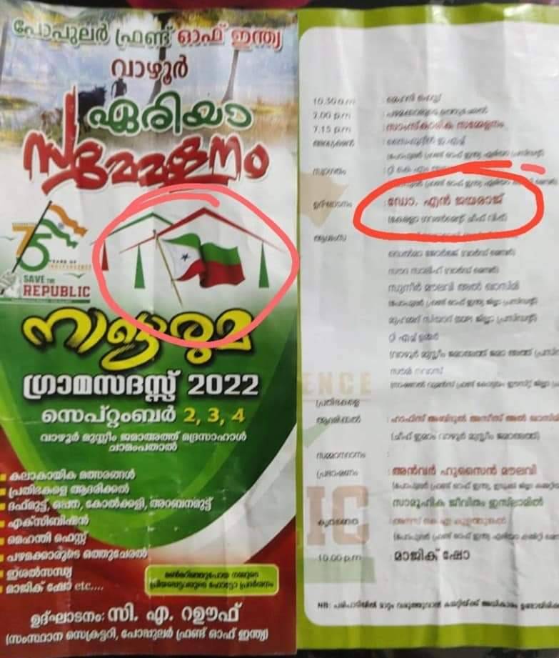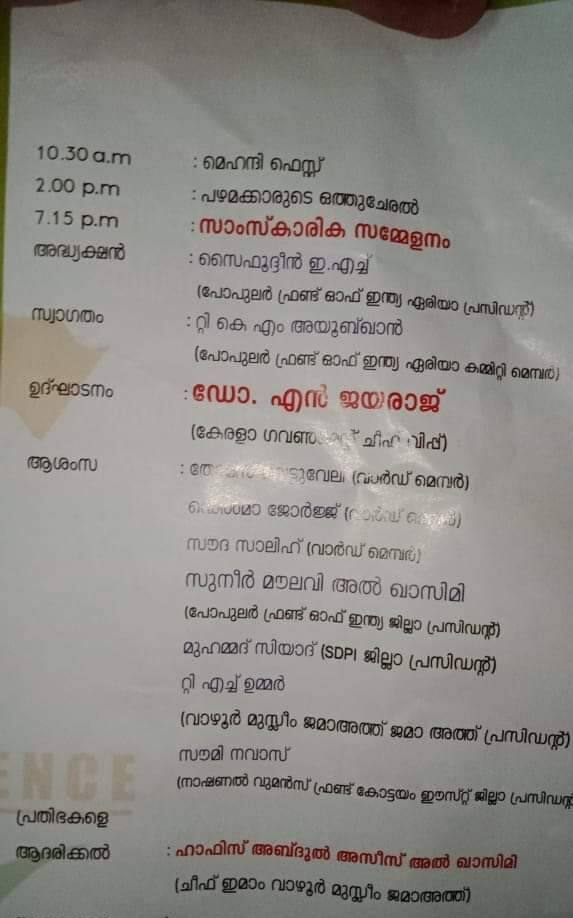 ഗവൺമെന്റ് ചീഫ് വിപ്പ് എൻ ജയരാജ് പോപ്പുലർ ഫ്രണ്ട് പരിപാടിയുടെ ഉദ്ഘാടകൻ; ചോദിച്ചിട്ടല്ല പേര് വെച്ചതെന്ന് വിശദീകരണം