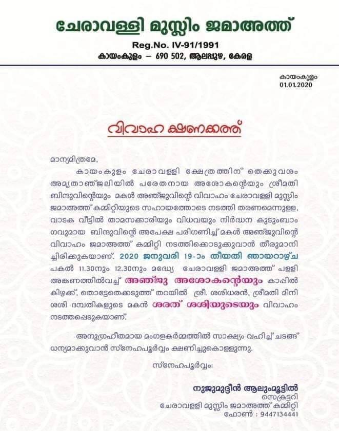 പരേതനായ അശോകന്റേയും ബിന്ദുവിന്റേയും മകള് അഞ്ജു അശോകന്റെ വിവാഹം ആഘോഷപൂര്വ്വം നടത്തി കൊടുക്കാനുള്ള തിരക്കിലാണ് കായംകുളം ചേരാവള്ളി മുസ്ലീം ജമാഅത്ത് കമ്മിറ്റി. അഞ്ജുവിന്റെ വിവാഹത്തിന്റെ ആഘോഷങ്ങളെ കുറിച്ചും അവസാനവട്ട ഒരുക്കങ്ങളെ കുറിച്ചും തീരുമാനിക്കാന് വെള്ളിയാഴ്ച പ്രത്യേക ജനറല്ബോഡി യോഗവും ചേരുന്നുണ്ട്.