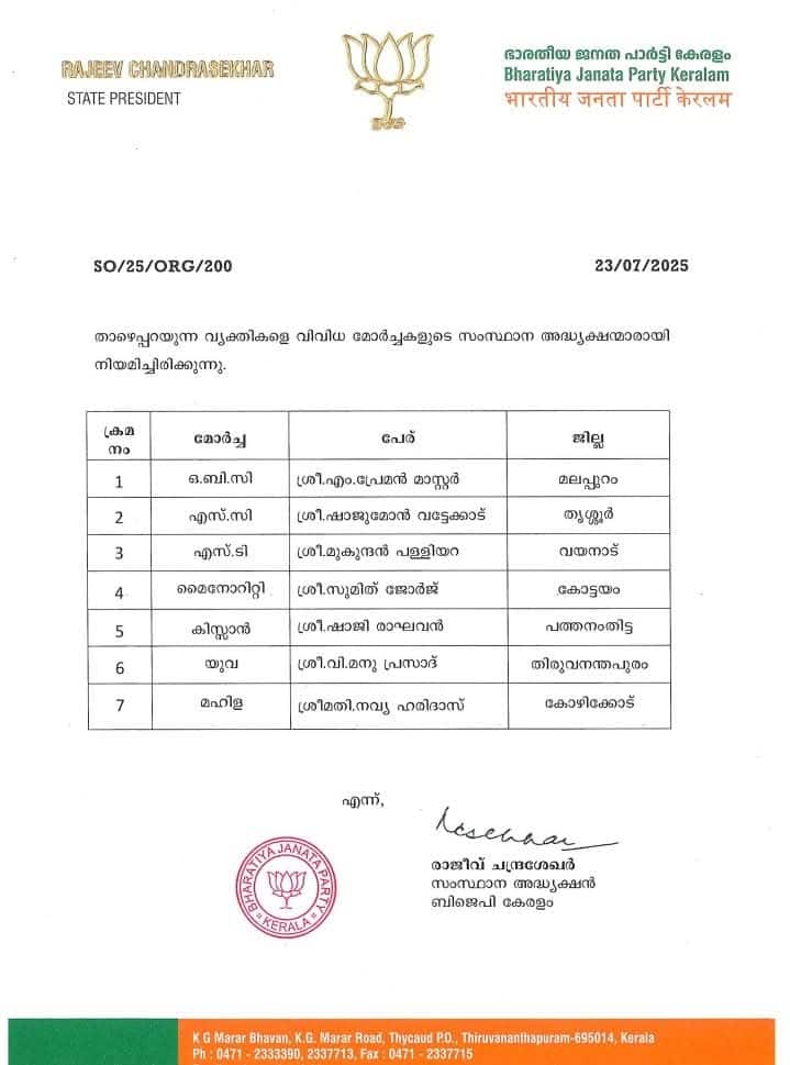 ഒബിസി മോര്ച്ചയുടെ അധ്യക്ഷനായി എം പ്രേമന് മാസ്റ്ററേയും എസ് സി മോര്ച്ചയുടെ അധ്യക്ഷനായി ഷാജുമോന് വട്ടേക്കാടിനേയും പ്രഖ്യപിച്ചു. മുകുന്ദന് പള്ളിയറയാണ് എസ് ടി മോര്ച്ചയുടെ അധ്യക്ഷന്. സുമിത് ജോര്ജിനെ മൈനോരിറ്റി മോര്ച്ചയുടെ അധ്യക്ഷനായും ഷാജി രാഘവനെ കിസ്സാന് മോര്ച്ചയുടെ അധ്യക്ഷനായും തീരുമാനിച്ചു