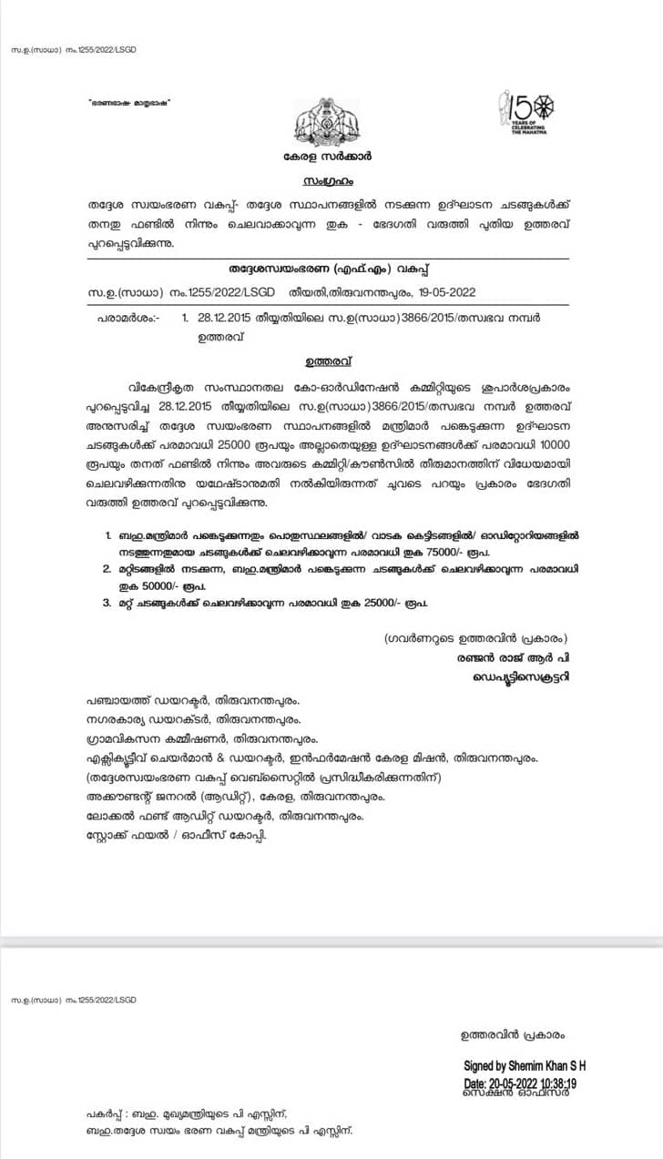 മന്ത്രിമാര് പങ്കെടുക്കുന്ന ഉദ്ഘാടന പരിപാടികള്ക്ക് 25,000 രൂപയും അല്ലാതെയുള്ള പൊതുപരിപാടികള്ക്ക് 10,000 രൂപയും ചെലവഴിക്കാമെന്ന് 2015ല് അന്നത്തെ സര്ക്കാരാണ് നിശ്ചയിച്ചിരുന്നത്.