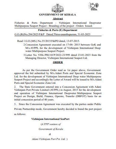 തിരുവനന്തപുരം: വിഴിഞ്ഞത്തെ അന്താരാഷ്ട്ര തുറമുഖം ഇനി മുതല് വിഴിഞ്ഞം ഇന്ര്നാഷണല് സീപോര്ട്ട് (PPP Venture of Government of Kerala & Adani Vizhinjam Port Pvt Ltd എന്ന നാമത്തില് അറിയപ്പെടും. തുറമുഖ മന്ത്രിയുടെ പദ്ധതി അവലോകന യോഗത്തില് എടുത്ത തീരുമാനമാണ് സര്ക്കാര് ഉത്തരവായി ഇറങ്ങിയിട്ടുള്ളത്.