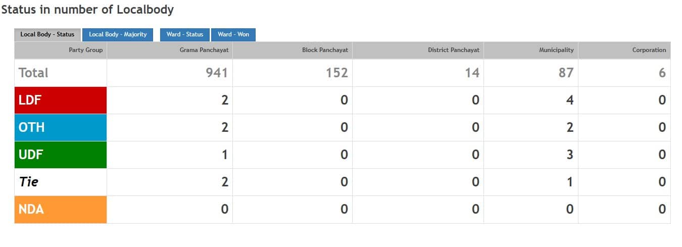 തദ്ദേശ തിരഞ്ഞെടുപ്പ് ഫലം കൃത്യവും സമഗ്രവുമായി സംസ്ഥാന തിരഞ്ഞെടുപ്പ് കമ്മീഷന്റെ ‘ട്രെൻഡ്’ വെബ്സൈറ്റിൽ നിന്നും തത്സമയം അറിയാം. https://trend.sec.kerala.gov.in, https://lbtrend.kerala.gov.in, https://trend.kerala.nic.in എന്നീ വെബ് സൈറ്റുകളിൽ തിരഞ്ഞെടുപ്പ് ഫലം ലഭ്യമാണ്. സംസ്ഥാനത്തെ മുഴുവൻ തദ്ദേശ സ്ഥാപനങ്ങളുടെയും ഫലം ജില്ലാ അടിസ്ഥാനത്തിൽ ഗ്രാമപഞ്ചായത്ത്, ബ്ലോക്ക് പഞ്ചായത്ത്, ജില്ലാപഞ്ചായത്ത്, മുനിസിപ്പാലിറ്റി, കോർപ്പറേഷൻ എന്നിങ്ങനെ തിരിച്ച് ഒറ്റ നോട്ടത്തിൽ മനസിലാകുന്ന വിധം സൈറ്റിൽ ലഭ്യമാകും. ഓരോ ബൂത്തിലെയും സ്ഥാനാർത്ഥികളുടെ വോട്ടു നില അപ്പപ്പോൾ തന്നെ സൈറ്റിൽ അപ്ലോഡ് ചെയ്യും.