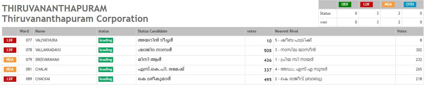 തിരുവനന്തപുരം കോർപറേഷനിൽ മൂന്നിടത്ത് എൽഡിഎഫും രണ്ടിടത്ത് എൻഡിഎയും ലീഡ് ചെയ്യുന്നു