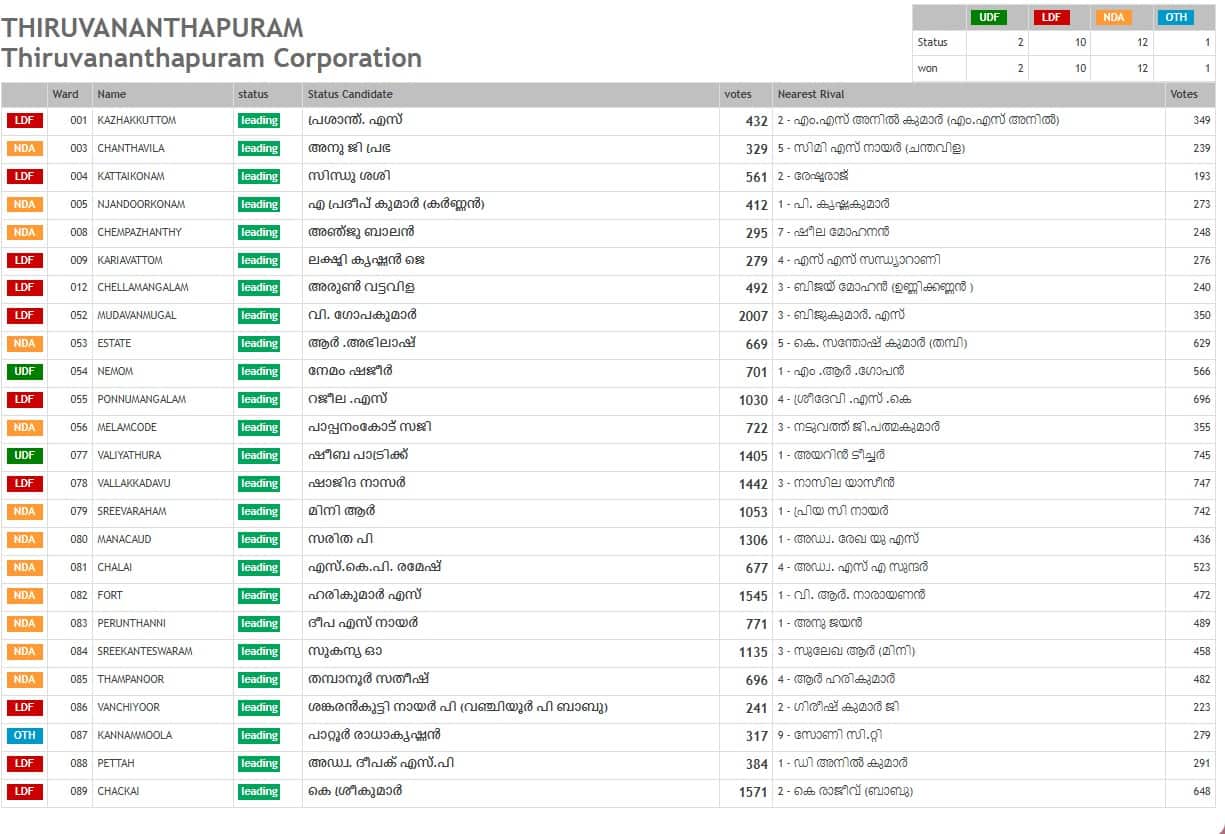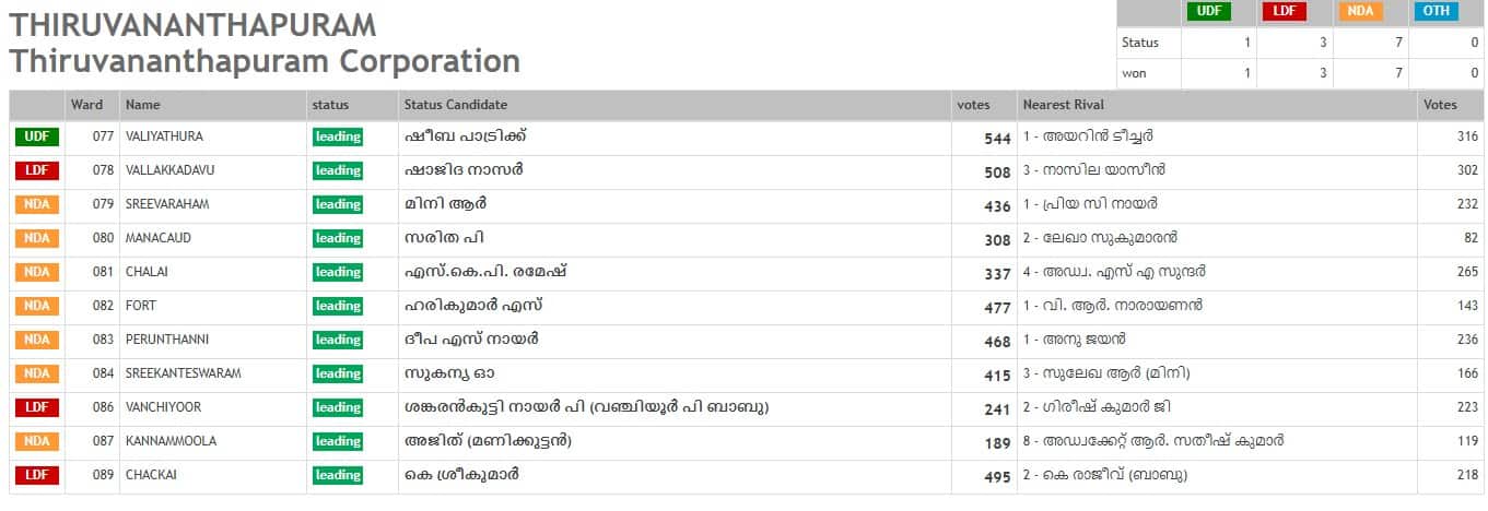 തിരുവനന്തപുരം കോർപറേഷനിൽ 12 ഇടത്ത് എൻഡിഎയും 10 ഇടത്ത് എൽഡിഎഫും 2 ഇടത്തും യുഡിഎഫും ലീഡ് ചെയ്യുന്നു