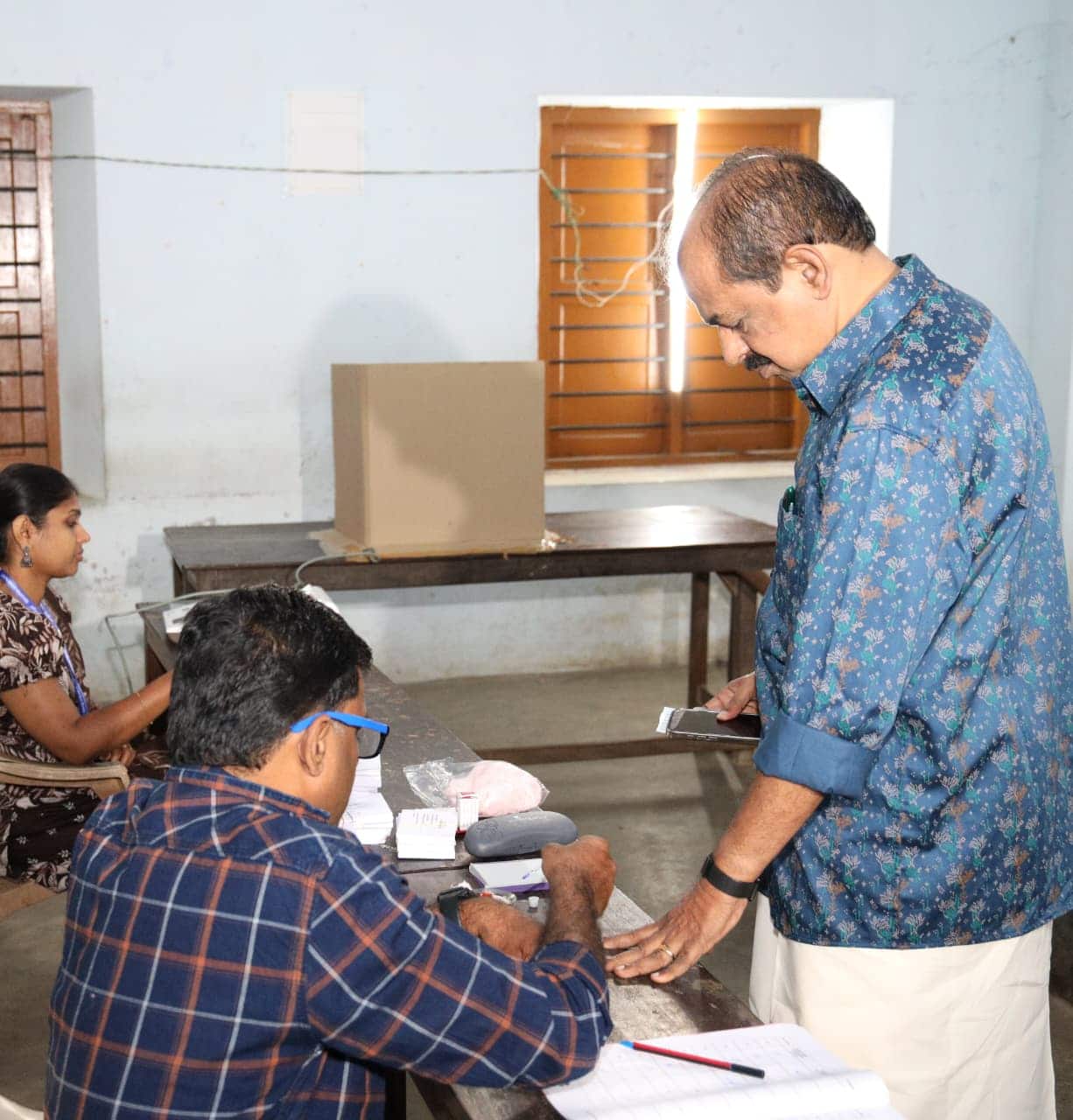 സഹകരണം-ദേവസ്വം- തുറമുഖം വകുപ്പുമന്ത്രി വി എൻ വാസവൻ പാമ്പാടി എംജിഎം ഹൈസ്കൂളിലെ ഒന്നാം നമ്പർ ബൂത്തിൽ വോട്ട് രേഖപ്പെടുത്തി.