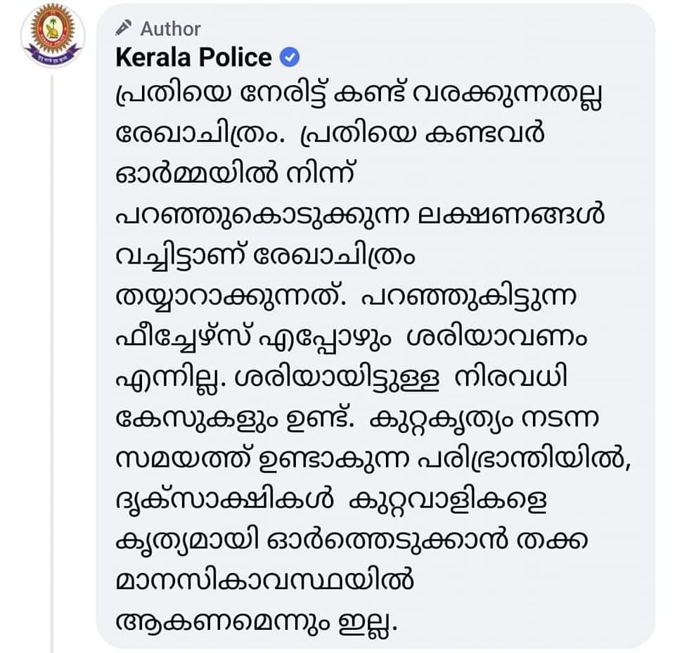 ”പ്രതിയെ നേരിട്ട് കണ്ട് വരക്കുന്നതല്ല രേഖാചിത്രം. പ്രതിയെ കണ്ടവർ ഓർമ്മയിൽ നിന്ന് പറഞ്ഞുകൊടുക്കുന്ന ലക്ഷണങ്ങൾ വച്ചിട്ടാണ് രേഖാചിത്രം തയ്യാറാക്കുന്നത്. പറഞ്ഞുകിട്ടുന്ന ഫീച്ചേഴ്സ് എപ്പോഴും ശരിയാവണം എന്നില്ല. ശരിയായിട്ടുള്ള നിരവധി കേസുകളും ഉണ്ട്. കുറ്റകൃത്യം നടന്ന സമയത്ത് ഉണ്ടാകുന്ന പരിഭ്രാന്തിയിൽ, ദൃക്സാക്ഷികൾ കുറ്റവാളികളെ കൃത്യമായി ഓർത്തെടുക്കാൻ തക്ക മാനസികാവസ്ഥയിൽ ആകണമെന്നും ഇല്ല”- ഫേസ്ബുക്ക് കമന്റിലൂടെ പൊലീസ് വ്യക്തമാക്കി.