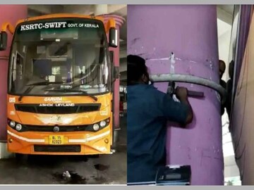 KSRTC Swift | സ്വിഫ്റ്റ് ബസ് തൂണൂകൾക്കിടയിൽ കുടുങ്ങി; പുറത്തെടുത്തത് പില്ലര് ഗാര്ഡ് പൊളിച്ചുമാറ്റിയ ശേഷം