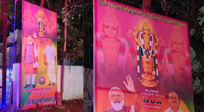 വി.മുരളീധരന്റെയും നരേന്ദ്രമോദിയുടെയും ചിത്രങ്ങള്ക്കൊപ്പമാണ് വിഗ്രഹത്തിന്റെ ചിത്രവും ഉള്പ്പെടുത്തിയിരിക്കുന്നത്. 'ശ്രീ ജനാര്ദ്ദന സ്വാമിക്ക് പ്രണാമം' എന്നും ബോര്ഡില് രേഖപ്പെടുത്തിയിട്ടുണ്ട്.