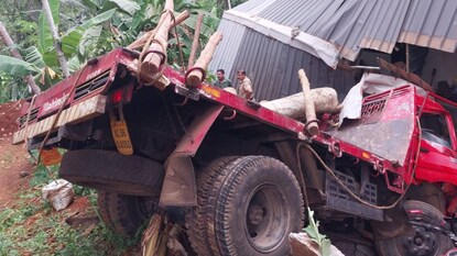 താമരശ്ശേരിയിൽ മരം കയറ്റിവന്ന ലോറി വീടിനു മുകളിലേക്ക് മറിഞ്ഞു