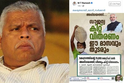 കണ്ണൂര്: കേന്ദ്ര സർക്കാരിന്റെ നേതൃത്വത്തിൽ അരി വിതരണവും സൗജന്യം കിറ്റ് വിതരണവും ഈ മാസവും തുടരും എന്ന് പോസ്റ്റിട്ട ബി.ജെ.പി നേതാവ് എം.ടി രമേശിനെ പരിഹസിച്ച് സി.പി.എം കണ്ണൂർ ജില്ലാ സെക്രട്ടറി എം.വി ജയരാജൻ. ഫേസ്ബുക്ക് പേസ്റ്റിലാണ് ജയരാജൻ ബി.ജെ.പി നേതാവിന് മറുപടി നൽകിയിരിക്കുന്നത്. കേന്ദ്രത്തില് നിന്ന് 70,000 മെട്രിക്ക് ടണ് അരിയെത്തി, വീണ്ടും കിറ്റ് വിതരണം എന്നായിരുന്നു എം.ടി രമേശിന്റെ ഫേസ്ബുക്ക് പോസ്റ്റ്.