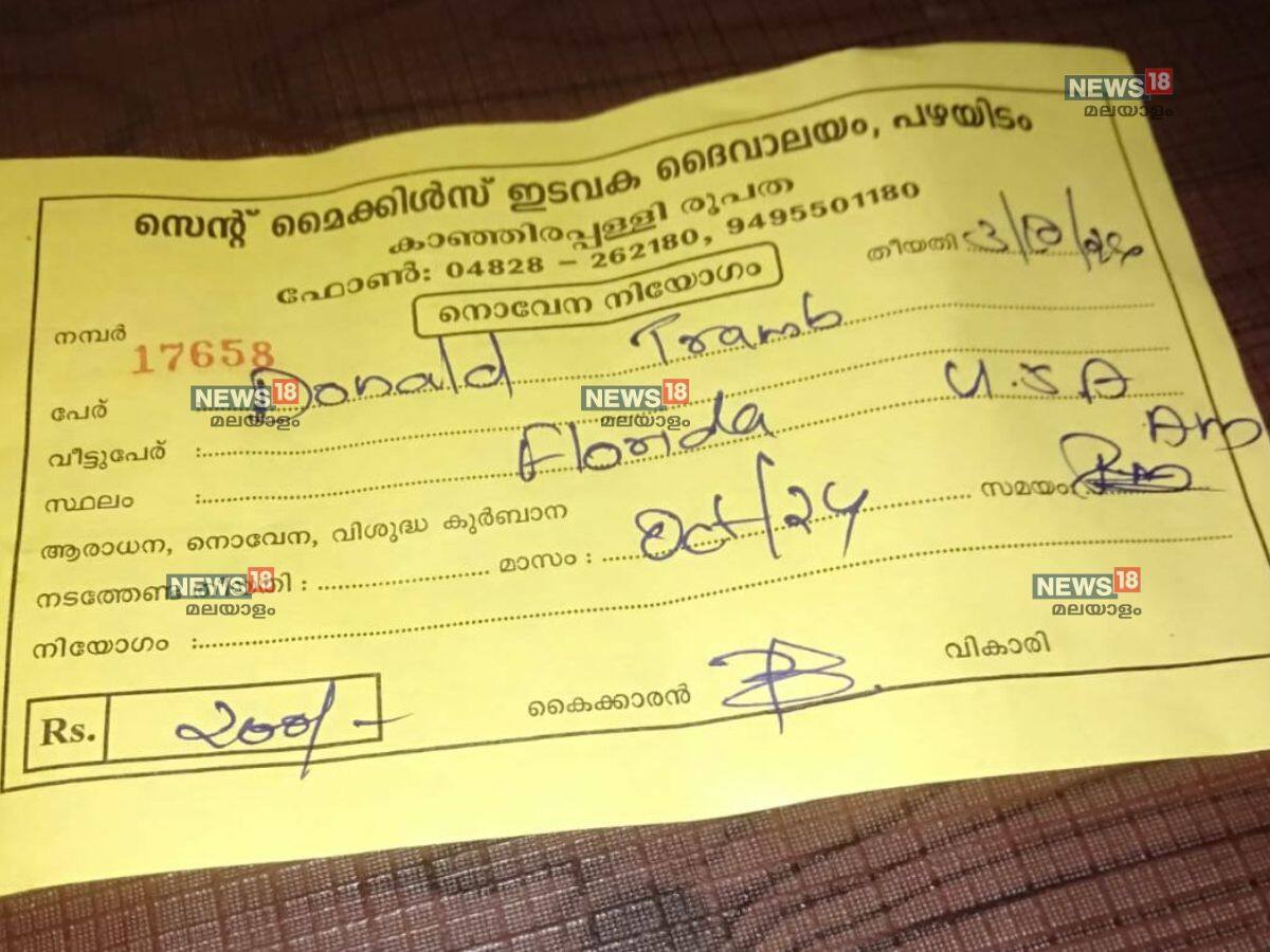 കോട്ടയം കാഞ്ഞിരപ്പള്ളി രൂപതയിലെ പഴയിടം സെന്റ് മൈക്കിൾസ് ഇടവക ദേവാലയത്തിലാണ് ഒരു മാസം മുൻപ് ട്രംപിനായി പ്രത്യേക പ്രാർത്ഥനയായ നൊവേന നടന്നത്. നൊവേനയുമായി ബന്ധപ്പെട്ട് ദേവാലയത്തിലെ രസീതിന്റെ ചിത്രം ന്യൂസ് 18ന് ലഭിച്ചു. ഒക്ടോബർ മൂന്നാം തീയതിയായിരുന്നു 200 രൂപ അടച്ച് ഡോണൾഡ് ട്രംപിനായി നൊവേന ബുക്ക് ചെയ്തത്. പേര് ഡോണൾഡ് ട്രംപ്, സ്ഥലം ഫ്ലോറിഡ, യുഎസ്എ എന്നാണ് രസീതിൽ രേഖപ്പെടുത്തിയിരിക്കുന്നത്.