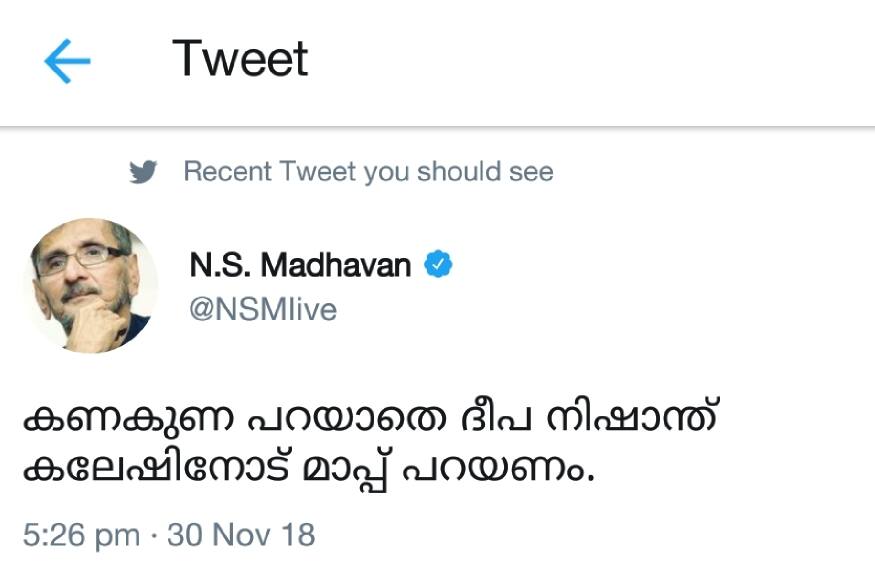 തിരുവനന്തപുരം: മലയാള സാഹിത്യത്തില് പുതിയ വിവാദത്തിന് തിരികൊളുത്തിയ കവിതാ വിവാദത്തില് ദീപാ നിശാന്തിനെതിരെ എന്എസ് മാധവന്. 'കണകുണ പറയാതെ ദീപാ നിശാന്ത് കലേഷിനോട് മാപ്പ് പറയണമെന്ന്' അദ്ദേഹം ട്വിറ്ററില് കുറിച്ചു. കവിതാ മോഷണം ചര്ച്ചയായതിനു പിന്നാലെയാണ് സാഹിത്യ ലോകത്ത് നിന്ന നിരവധിയാളുകള് വിഷയത്തില് അഭിപ്രായം രേഖപ്പെടുത്തിയത്.