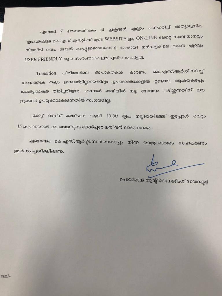 അതേസമയം ഇപ്പോഴത്തെ വിവാദങ്ങളിൽ കാര്യമില്ലെന്നും യാത്രക്കാർക്ക് സൗകര്യപ്രദമായ ഒട്ടേറെ ഓപ്ഷനുകൾ ഉൾപ്പെടുത്തിയാണ് വെബ്സൈറ്റ് പരിഷ്ക്കരിക്കുന്നതെന്ന് കെ.എസ്.ആർ.ടി.സി അധികൃതർ പറയുന്നു. യാത്രക്കാരുടെ പരാതികളും ആക്ഷേപങ്ങളും പരിഹരിക്കുമെന്നും അവർ പറഞ്ഞു. ആധുനികവൽക്കരണത്തിന്റെ ഭാഗമായാണ് വെബ്സൈറ്റ് പരിഷക്കരിക്കുന്നത്. ഓൺലൈൻ ബുക്കിങ് സംവിധാനം 2015ൽ ആരംഭിക്കുമ്പോൾ ടിക്കറ്റൊന്നിന് 15.50 രൂപയാണ് ഓപ്പറേറ്റിങ് കമ്പനിക്ക് നൽകിയത്. 2018 ഏപ്രിലിൽ ഈ തുക 3.25 രൂപയായി കുറച്ച് മറ്റൊരു കമ്പനിക്ക് നൽകിയിരുന്നു. എന്നാൽ ഈ കമ്പനി ചില വെബ്സൈറ്റിൽ വരുത്തിയ ചില തെറ്റുകൾ കാരണം കോർപറേഷന് വലിയ നഷ്ടമുണ്ടായിരുന്നു. ഇതേത്തുടർന്ന് ഇവരുമായുള്ള കരാർ റദ്ദാക്കുകയായിരുന്നു. ഇന്ത്യയിലെ നിരവധി സംസ്ഥാനങ്ങളിലെ ട്രാൻസ്പോർട്ട് കോർപറേഷനുകളിലെ ഓൺലൈൻ ടിക്കറ്റ് സംവിധാനം കൈകാര്യം ചെയ്യുന്ന കമ്പനിയ്ക്കാണ് പുതിയതായി കരാർ നൽകിയിരിക്കുന്നത്. ടിക്കറ്റൊന്നിന് വെറും 45 പൈസ നിരക്കിൽ പൈലറ്റ് പ്രോജക്ടായാണ് നൽകിയിരിക്കുന്നത്.