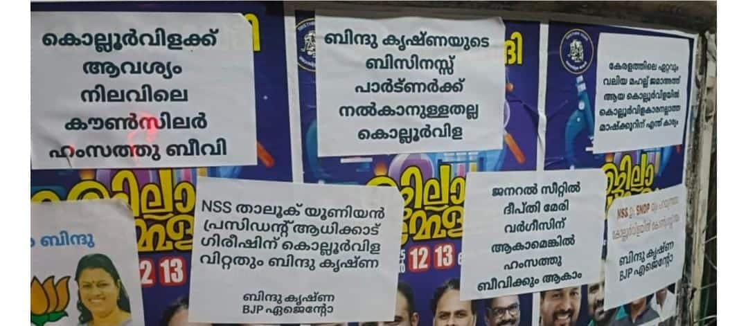 95 ശതമാനം മുസ്ലിം വോട്ടുള്ള കൊല്ലൂർ വിളയിൽ എൻഎസ്എസിന് എന്ത് കാര്യമെന്നും പോസ്റ്ററിൽ ചോദിക്കുന്നു. കൊല്ലത്ത് മത്സരിക്കാനായി സമുദായ നേതാക്കളുടെ പ്രീതിക്കായി കൊല്ലൂർവിള വിറ്റത് ബിന്ദു കൃഷ്ണയാണോയെന്നാരോപണവും പോസ്റ്ററിൽ ഉന്നയിക്കുന്നു.